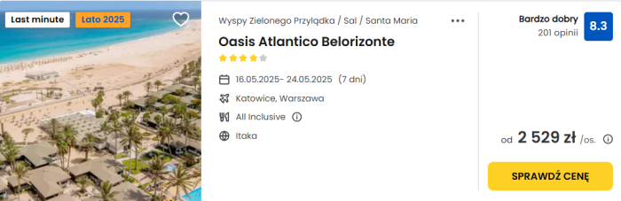 Aby pojechać na te wczasy wybierzcie okazję w najkorzystniejszej cenie (sprawdź tutaj). Wówczas możecie spędzić urlop w hotelu znanej sieci Oasis Atlantic Belorizonte na Wyspach Zielonego Przylądka na prawdę tanio. Swoją podróż rozpoczniecie i zakończycie na lotnisku Chopina w Warszawie. Organizatorem wycieczki jest renomowane biuro podróży. Na Wyspy Zielonego przylądka polecicie na pokładzie wyczarterowanego samolotu. W cenę wycieczki wliczony jest bagaż podręczny i rejsowy. Ponadto kwota obejmuje ubezpieczenie, transfery, opiekę rezydenta oraz pełne wyżywienie all inclusive.